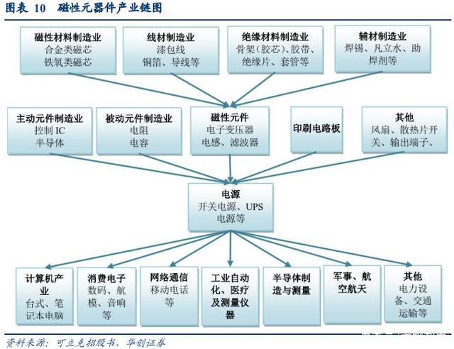 磁性元件為產(chǎn)業(yè)中游。上游包括線材制造業(yè)、磁材制造業(yè)、絕緣材料制造業(yè)及輔材制造業(yè),下游為各行業(yè)應(yīng)用的各種電源類產(chǎn)品(含逆變器)。