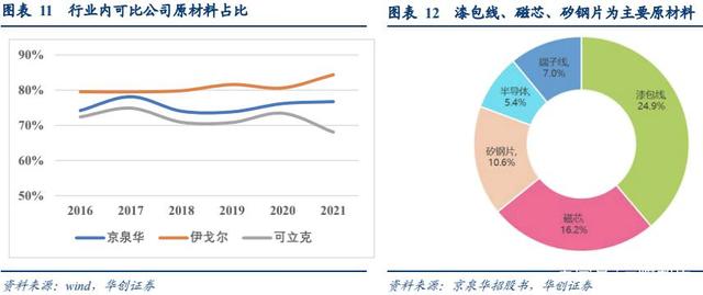 漆包線、磁芯、矽鋼片、半導(dǎo)體等為主要原材料。行業(yè)內(nèi)公司直接材料占比通常在 70%以上,主要原材料為漆包線、磁芯、矽鋼片、半導(dǎo)體等。以京泉華為例,漆包線、磁芯、矽鋼片、半導(dǎo)體分別占 2016 年采購金額 24.9%、16.2%、10.6%、5.4%。漆包線主要材料為銅材,矽鋼片以冷軋硅鋼為主要原材料。