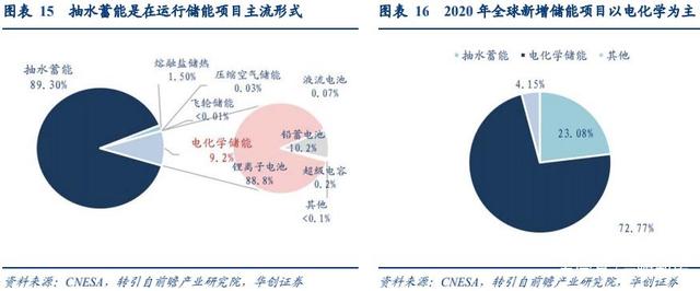 電化學(xué)儲能為新增儲能主流方案。過去國內(nèi)外儲能項(xiàng)目以抽水蓄能為主,截至 2020 年抽水蓄能在全球儲能的裝機(jī)占比高達(dá) 89.3%,其次則是電化學(xué)儲能,占比達(dá) 9.2%。而在 2020年新增儲能裝機(jī)中,電化學(xué)儲能裝機(jī)占比卻高達(dá)近 73%,是目前主流的儲能裝機(jī)技術(shù)方案。