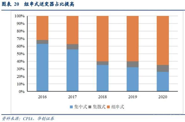 分布式光伏崛起,組串式逆變器占比提高。分布式光伏崛起疊加組串式在集中電站的滲透,組串式逆變器占比不斷提高,2020 年國內(nèi)組串式逆變器占比接近 65%。