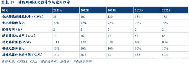 儲能逆變器市場空間推導(dǎo):全球儲能新增裝機(jī)量根據(jù) CNESA、CPIA 數(shù)據(jù)整理,其中電化學(xué)儲能占比根據(jù) 2020 數(shù)據(jù)取 72%;按配儲時(shí)間 2h 計(jì)算逆變器裝機(jī)功率;根據(jù)固德威披露數(shù)據(jù),2019 年儲能逆變器價(jià)值量在 1.2~1.6 元/W,取 2019 年 1.4 元/W,按照每年10%降本進(jìn)行計(jì)算。我們計(jì)算得 2021 年儲能逆變器用磁性元器件市場空間 14.3 億元,2025 年市場空間 50.4 億元,4 年 CAGR 37%(2022 年《“十四五”可再生能源發(fā)展規(guī)劃》等政策不斷刺激儲能市場發(fā)展,預(yù)計(jì) 22 年儲能逆變裝機(jī)規(guī)模 36GW,同比增速 177%,高于 4 年復(fù)合增速)。我們預(yù)測光伏&儲能逆變器磁性元器件合計(jì)市場空間 2021 年 53.3億元, 2025 年 113.4 億元,4 年 CAGR 20.8%。