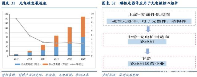 政策+下游需求雙重刺激充電樁有望加速,磁性元器件應(yīng)用于充電樁核心組件。過去幾年中國充電樁保有量快速增長,車樁比不斷降低,然而截止 2020 年車樁比仍有 2.9,離《電動(dòng)汽車充電基礎(chǔ)設(shè)施發(fā)展指南(2015-2020 年)》1.04 的目標(biāo)仍有較大差距,在政策+下游需求雙重刺激下充電樁有望加速發(fā)展。充電樁主要分為充電模塊、主控板、充電槍/線束、殼體,其中充電模塊是核心部件之一,具有交直流轉(zhuǎn)換等功能,磁性元器件主要運(yùn)用于充電模塊。