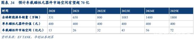 預(yù)計(jì)車載磁性元器件市場空間 25 年超 70 億。根據(jù) EV TANK 數(shù)據(jù),2025 年全球新能源車銷量 1800 萬輛,十年 CAGR 40.3%;根據(jù)產(chǎn)業(yè)鏈調(diào)研顯示純電動(dòng)車單車磁性元器件價(jià)值量在 300~500,取單車價(jià)值量 400 計(jì)算。根據(jù)我們計(jì)算結(jié)果 21 年車載磁性元器件市場空間 26 億元,25 年車載磁性件市場空間有望超 70 億,4 年 CAGR 28.1%。