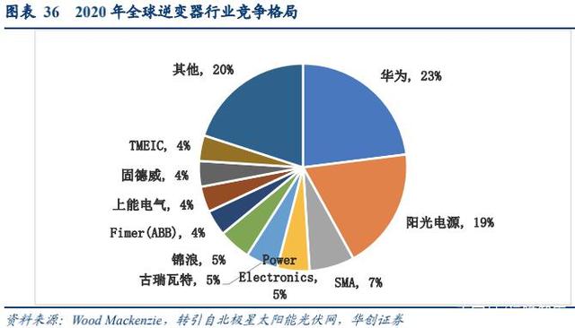 下游逆變器行業(yè)集中度高,國內(nèi)廠家居前。全球光伏產(chǎn)業(yè)鏈各個(gè)環(huán)節(jié)的主要生產(chǎn)地均在中國。國內(nèi)逆變器廠家憑借成本、完善的產(chǎn)業(yè)鏈布局、快速發(fā)展的市場等優(yōu)勢全球市場份額不斷提升,其中華為、陽光電源自 2015 年起穩(wěn)居市場前二,國內(nèi)其他廠家如錦浪科技、固德威也迎來快速發(fā)展。根據(jù) Wood Mackenzie 數(shù)據(jù) 2020 行業(yè) CR10 近 80%,前兩名玩家華為、陽光電源分別占據(jù) 23%、19%份額,CR2 42%,加上其他國內(nèi)廠家前十名里國內(nèi)廠家份額高達(dá) 60%。
