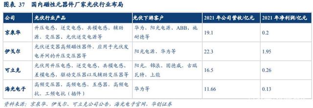 作為逆變器上游的磁性元器件國內(nèi)廠家同樣處于領(lǐng)先地位,頭部企業(yè)有京泉華、海光電子、可立克、伊戈?duì)?。各磁性元器件廠家客戶和產(chǎn)品各有側(cè)重,收入規(guī)模皆超 10 億元。