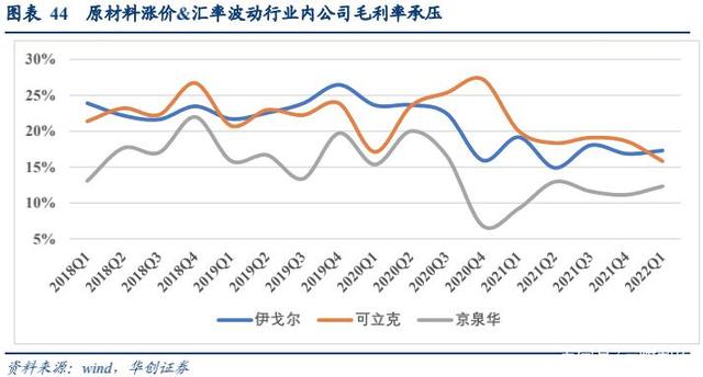 人民幣貶值、大宗企穩(wěn)回落迎拐點(diǎn)。受制于原材料漲價(jià)和匯率波動(dòng),行業(yè)內(nèi)公司盈利水平承壓,2020Q3 起國內(nèi)代表企業(yè)毛利率下滑。22 年 4 月下旬美元兌人民幣匯率從 6.36快速上行,目前匯率在 6.66 區(qū)間,全年維度看隨著大宗商品價(jià)格企穩(wěn)回落、匯率逐漸修復(fù),行業(yè)內(nèi)公司盈利水平有望逐漸修復(fù),拐點(diǎn)出現(xiàn)。