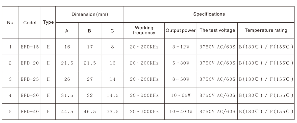 EFD磁芯符合行業(yè)標(biāo)準(zhǔn)的經(jīng)濟(jì)型平面設(shè)計(jì),此結(jié)構(gòu)變壓器可為電路節(jié)省大量空間,其橫截面特別針對(duì)超薄變壓器而優(yōu)化,非常適合超薄變壓器和電感器使用。EFD型變壓器常用規(guī)格有EFD-15,EFD-20,EFD-25,EFD-30,EFD-40等。