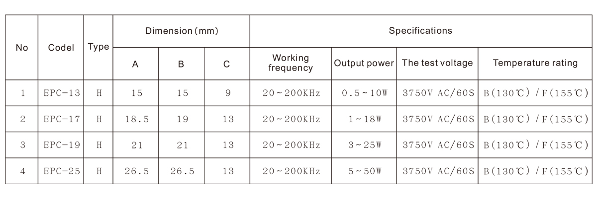 EPC型變壓器是為了適應(yīng)超薄型開關(guān)電源而設(shè)計(jì)的一款高頻變壓器。它擁有扁型的鐵氧體磁芯, 它的形狀能同時(shí)滿足電源變壓器高功率的要求和超薄體積的要求, 同樣也能適應(yīng)開關(guān)電源在溫升方面的要求,但對PCB板的要求會提高;它比EFD型變壓器在線包空間上有提高, 同時(shí)EMI性能和漏感、輻射等參數(shù)均優(yōu)于EFD型變壓器, 其它性能接近于EE型和EC型變壓器。EPC變壓器常用型號有EPC-10,EPC-13,EPC-17,EPC-19,EPC-25,EPC-30等。
